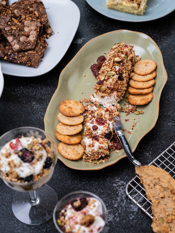 Generously sprinkle the top and sides of the goat cheese log with our Cranberry Spice granola. Use the plastic wrap to guide, reshape and roll goat cheese log until evenly covered in granola.